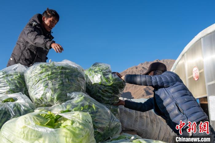 圖為當(dāng)?shù)剞r(nóng)牧民轉(zhuǎn)運(yùn)剛采摘的大棚蔬菜前往日喀則市區(qū)?!〗w波 攝