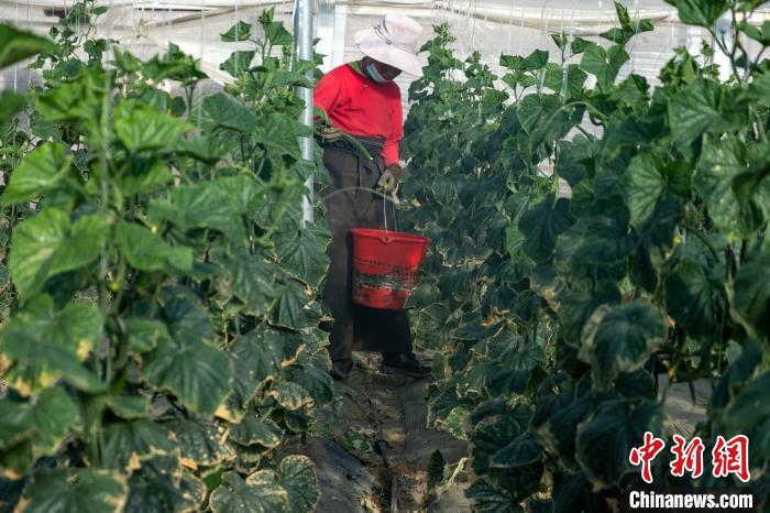圖為農(nóng)牧民采摘黃瓜?!〗w波 攝