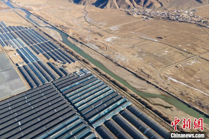圖為1月28日上午,航拍西藏日喀則珠峰現(xiàn)代農(nóng)業(yè)科技創(chuàng)新博覽園蔬菜大棚?!〗w波 攝