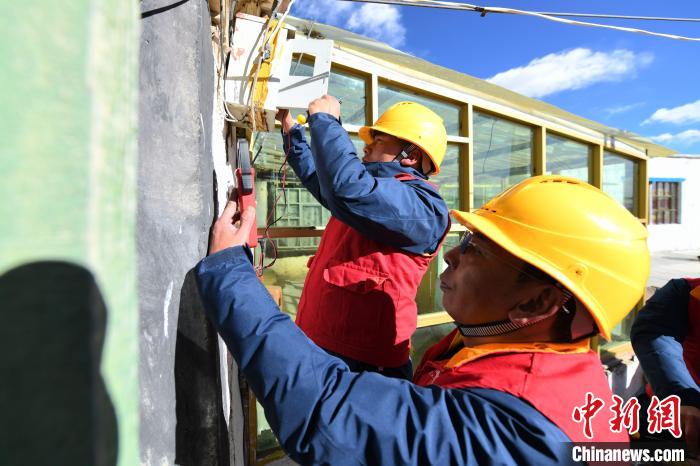 圖為米瑪次仁(右一)和同事檢修線路?!∷骼蚀稳?攝