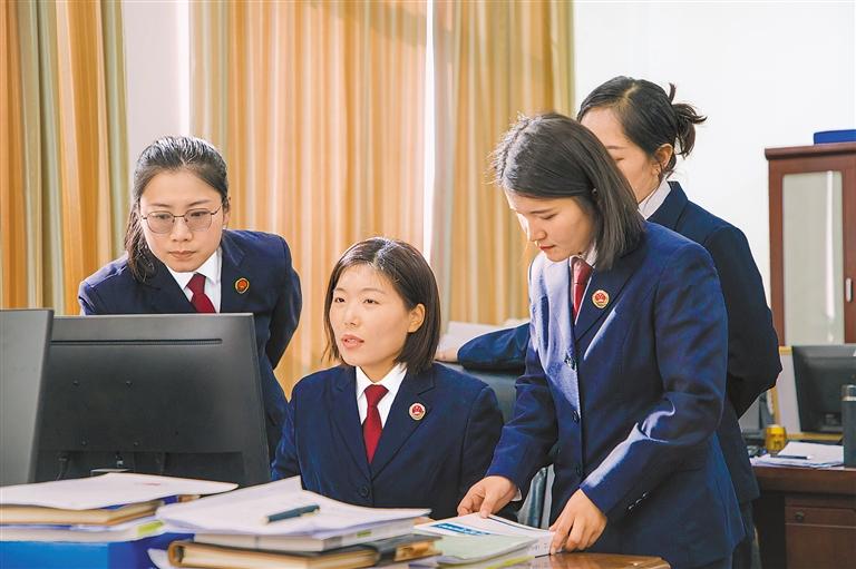 圖為席淑姣(左二)積極發(fā)揮傳幫帶作用,向年輕同事傳授辦案經(jīng)驗。