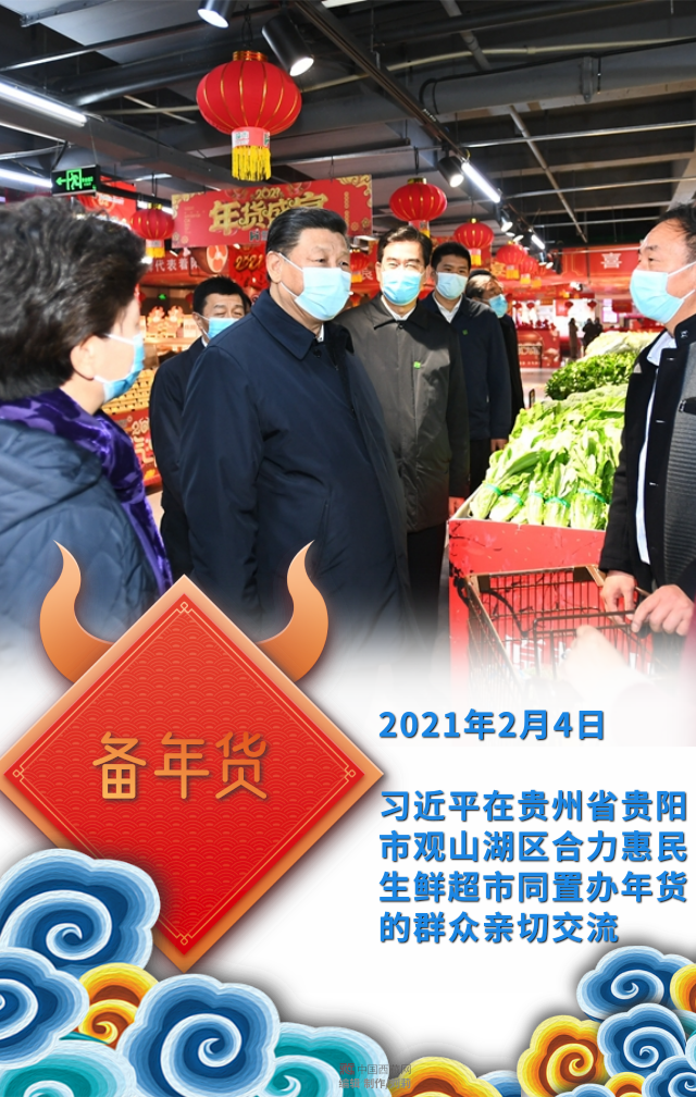 習近平在貴州省貴陽市觀山湖區(qū)合力惠民生鮮超市同置辦年貨的群眾親切交流