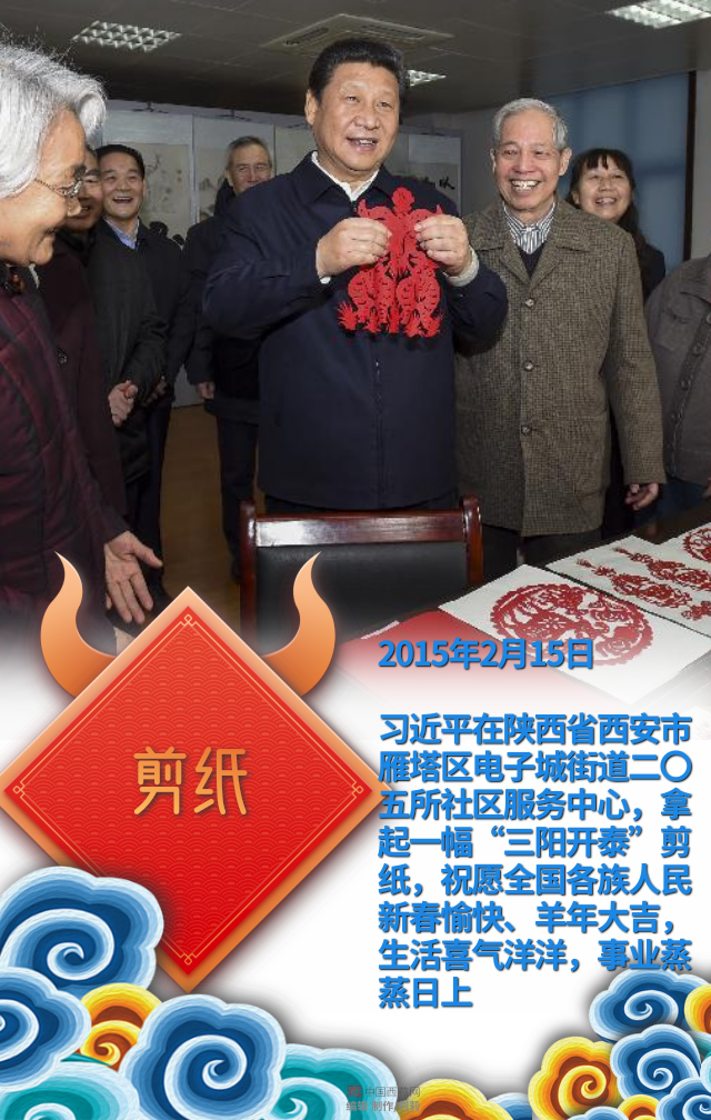 習近平在陜西省西安市雁塔區(qū)電子城街道二〇五所社區(qū)服務中心,拿起一幅“三陽開泰”剪紙,祝愿全國各族人民新春愉快、羊年大吉,生活喜氣洋洋,事業(yè)蒸蒸日上