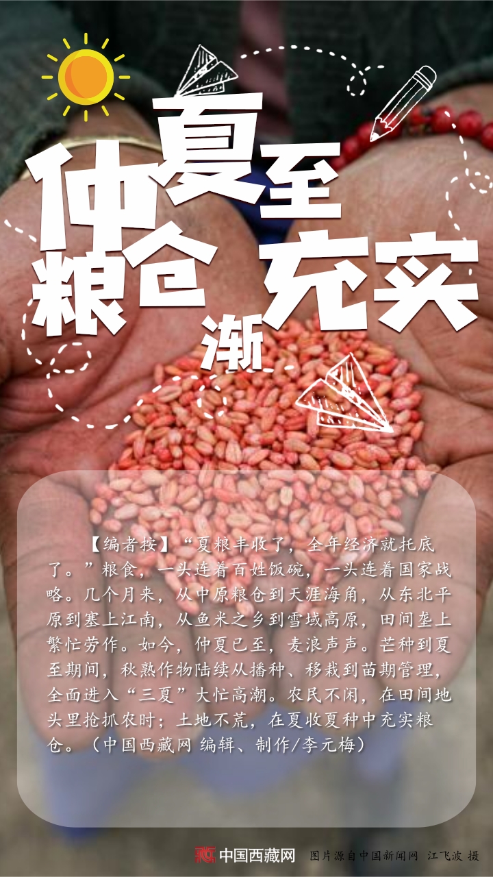 【編者按】“夏糧豐收了,全年經(jīng)濟(jì)就托底了。”糧食,一頭連著百姓飯碗,一頭連著國(guó)家戰(zhàn)略。幾個(gè)月來,從中原糧倉(cāng)到天涯海角,從東北平原到塞上江南,從魚米之鄉(xiāng)到雪域高原,田間壟上繁忙勞作。如今,仲夏已至,麥浪聲聲。芒種到夏至期間,秋熟作物陸續(xù)從播種、移栽到苗期管理,全面進(jìn)入“三夏”大忙高潮。農(nóng)民不閑,在田間地頭里搶抓農(nóng)時(shí);土地不荒,在夏收夏種中充實(shí)糧倉(cāng)。(中國(guó)西藏網(wǎng) 編輯、制作/李元梅)