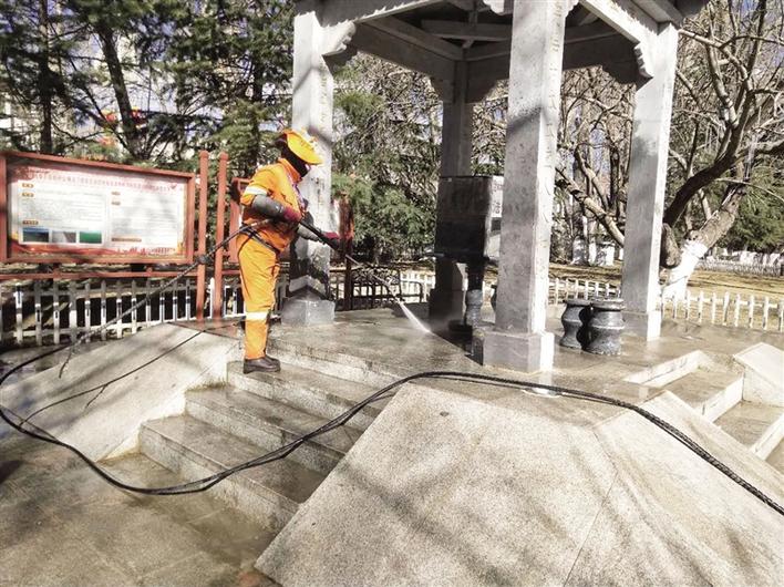 2月13日早上10點,由西藏拉薩市城關(guān)區(qū)環(huán)衛(wèi)局局長米瑪次仁牽頭,拉薩市城市建設(shè)投資經(jīng)營有限公司相關(guān)領(lǐng)導(dǎo)配合,調(diào)動50名保潔人員、4臺高壓沖洗車和1輛8噸灑水車,對宗角祿康公園內(nèi)原市民活動區(qū)域進行擦、沖、洗作業(yè)。