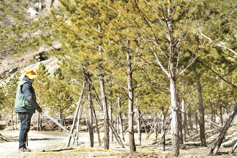 山上有了樹遠(yuǎn)遠(yuǎn)不夠,還要進(jìn)一步提高樹木的成活率,而樹木的成活率離不開后期的管護(hù)工作。因此,每年春天山體解凍后,就要保證每周給樹木澆一次水。另外,由于拉薩紫外線強(qiáng)度大、水分蒸發(fā)量高,有時(shí)還需要給樹木輸送營(yíng)養(yǎng)液……因此,一批批踏著晨露、身披晚霞的樹木養(yǎng)護(hù)工人每天穿梭于山間,檢查樹木的生長(zhǎng)情況,進(jìn)行補(bǔ)植補(bǔ)栽、灌溉等工作。拉薩市圣地園林公司相關(guān)負(fù)責(zé)人多布拉告訴記者:“我們從3月8日開始復(fù)工,作為園林工作人員,搶抓季節(jié)很重要,所以我們現(xiàn)在正在進(jìn)行補(bǔ)植補(bǔ)栽?!?/p>