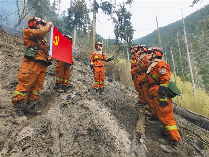 4月18日下午,米林縣森林消防中隊3名在火場中表現(xiàn)突出的消防隊員火線入黨。曾小鋒 記者 王珊 張猛 攝