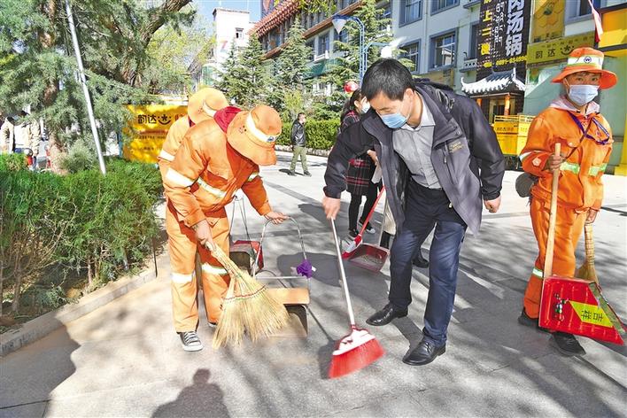 圖為拉薩市干部群眾和環(huán)衛(wèi)工人一起清掃路面。記者 李洲 攝