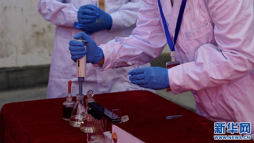 拉薩725油庫(kù)化驗(yàn)人員正在演示甲醛快速檢測(cè)法(10月21日攝)。新華網(wǎng) 達(dá)珍 攝
