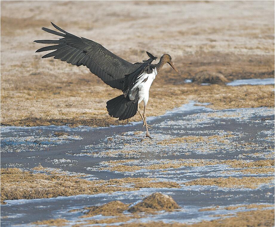 12月6日,一只黑鸛在西寧市北川河濕地公園內嬉戲。近日,位于青海省西寧市的北川河濕地公園迎來兩只黑鸛。黑鸛屬鸛形目、鸛科,國家一級保護動物,目前全世界僅存3000只左右,屬于國寶級珍禽。新華社記者吳剛攝