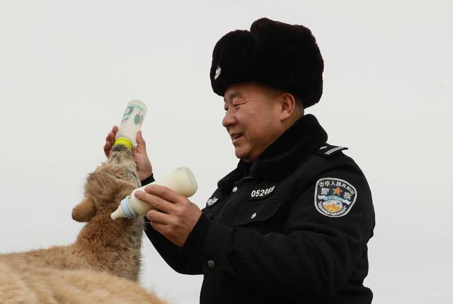 可可西里巡山隊員鄧海平在給藏羚羊幼仔喂奶(12月6日攝)。