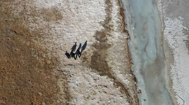 12月7日,站長趙新錄(中)與隊友鄧海平(左)、達(dá)才在可可西里索南達(dá)杰保護(hù)站管護(hù)區(qū)域內(nèi)巡查(無人機(jī)照片)。