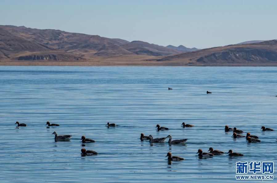 這是1月10日拍攝的羊卓雍錯湖面上的水鳥。新華社記者 孫非 攝
