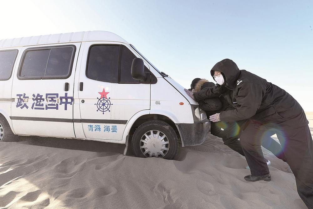 車緩緩駛向青海湖深處,即使穿得這么厚實(shí),但寒風(fēng)襲來時,巡湖隊員們依舊被凍得直哆嗦。