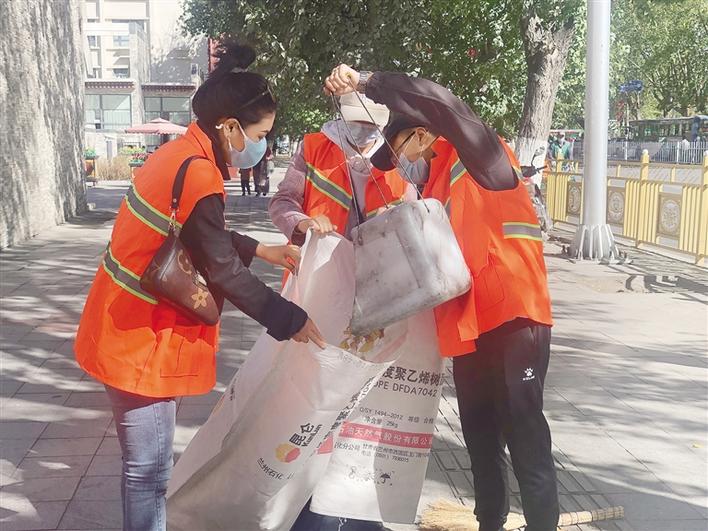 志愿者幫助環(huán)衛(wèi)工人清掃落葉