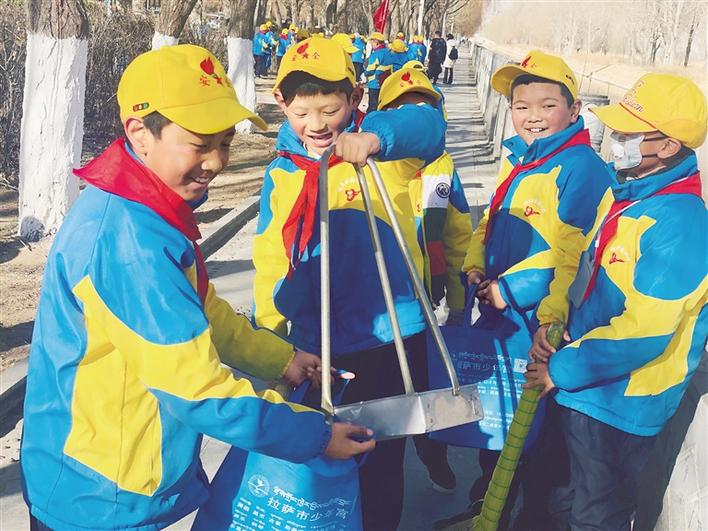 拉薩市城關(guān)區(qū)拉魯小學(xué)學(xué)生幫助環(huán)衛(wèi)工人清掃人行道