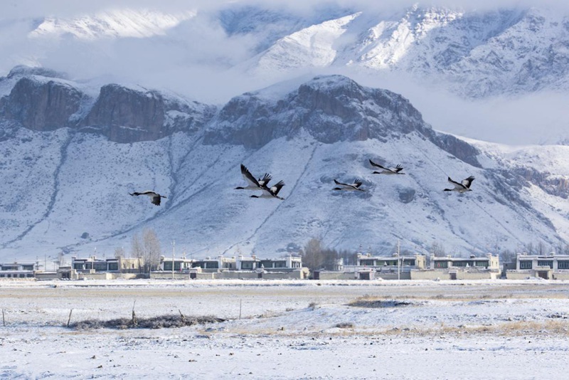 黑頸鶴在雪后的村莊上空飛翔。欒亞立攝