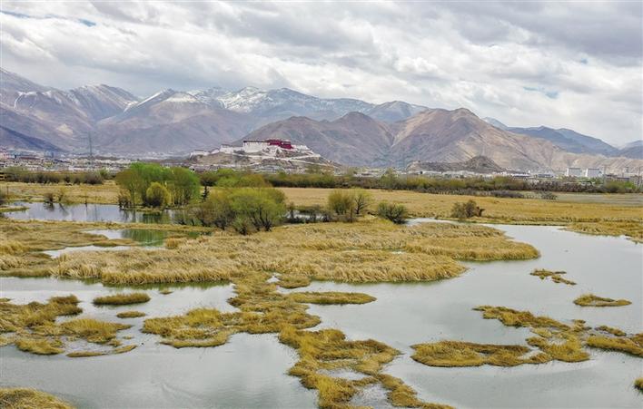 從拉薩市當(dāng)熱西路上向北望去,便能看到這塊北面靠山,東、南、西三面為市區(qū)包圍,面積12.2平方公里的濕地。遠(yuǎn)處,連綿起伏的山頂還覆蓋著薄薄的積雪,布達(dá)拉宮雄偉而秀美;近處,濕地內(nèi)隨意顯現(xiàn)出的一塊塊水泊,成群的候鳥在水中玩耍嬉戲、在藍(lán)天白云下飛舞。拾階過(guò)橋,一條木質(zhì)長(zhǎng)廊向濕地中延伸,只是我們這些不速之客的到來(lái),驚起水鳥無(wú)數(shù)。它們仿佛商量好似的沖上藍(lán)天,讓人為打擾它們的棲息而不安。