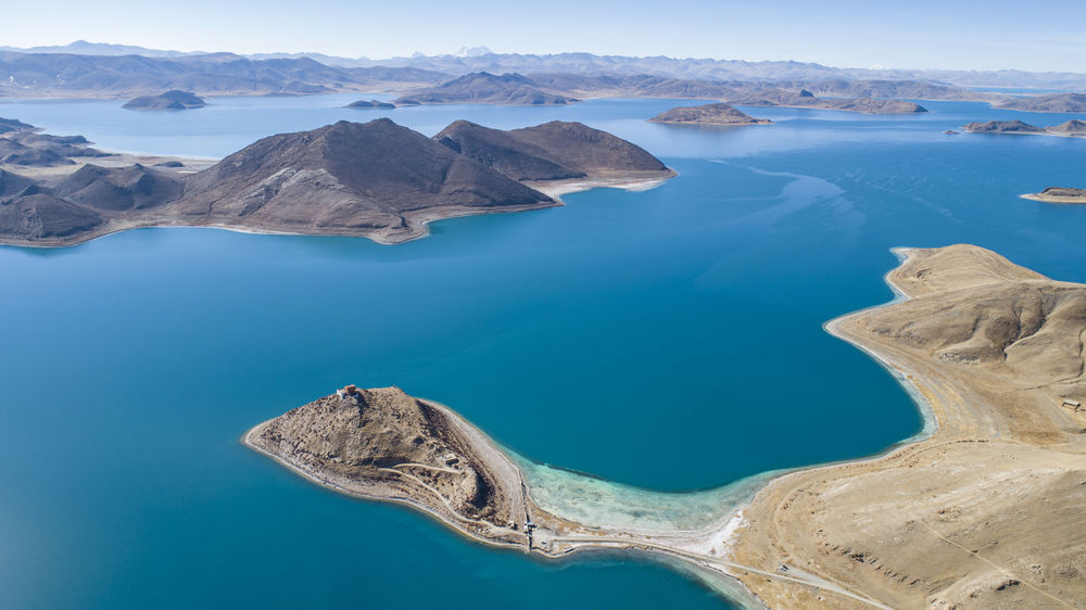 這是西藏羊卓雍錯景色(2021年1月10日攝,無人機照片)。