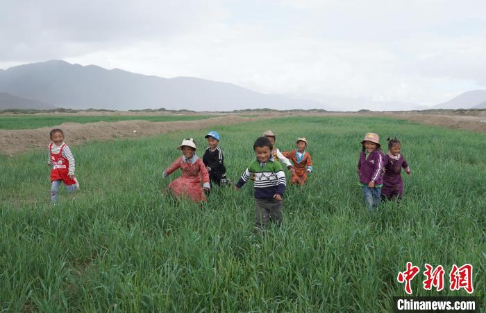 在綠麥草草場上玩耍的藏族兒童。 潘旭臨 攝