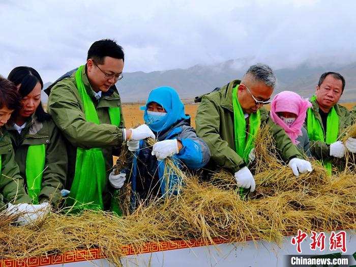圖為與會嘉賓在當地牧民指導下將牧草扎捆?!±铍h 攝