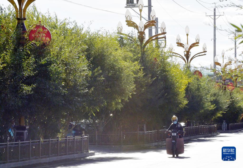 西藏阿里獅泉河鎮(zhèn)道路旁邊綠樹成蔭(9月19日攝)。新華社發(fā) (索朗羅布 攝)