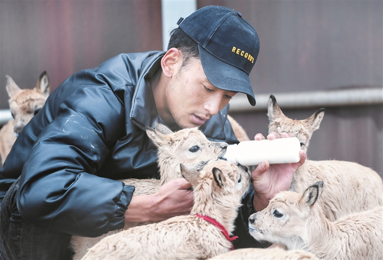 圖為可可西里國家級自然保護(hù)區(qū)卓乃湖保護(hù)站的工作人員才文多杰在給藏羚羊幼仔喂奶(2020年7月7日攝)。 新華社記者 薛玉斌攝