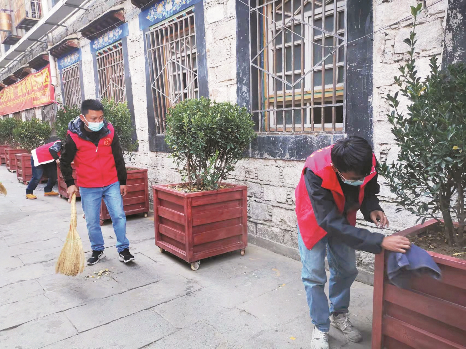 圖為策門(mén)林社區(qū)工作人員正在打掃轄區(qū)衛(wèi)生。 拉薩融媒記者 趙 慧攝