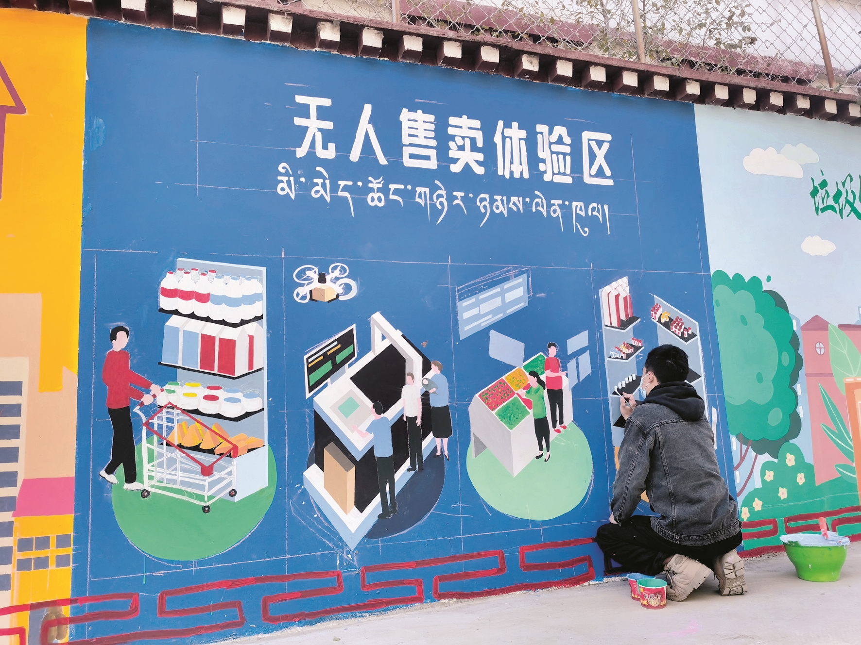 圖為工作人員正在對(duì)繞賽社區(qū)哈達(dá)巷進(jìn)行墻繪。拉薩融媒記者 范江英攝