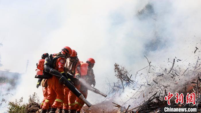 圖為3月2日,云南森林草原火災(zāi)應(yīng)急處置聯(lián)合實(shí)戰(zhàn)演練中常規(guī)裝備滅火?!≡颇鲜∩窒揽傟?duì) 攝