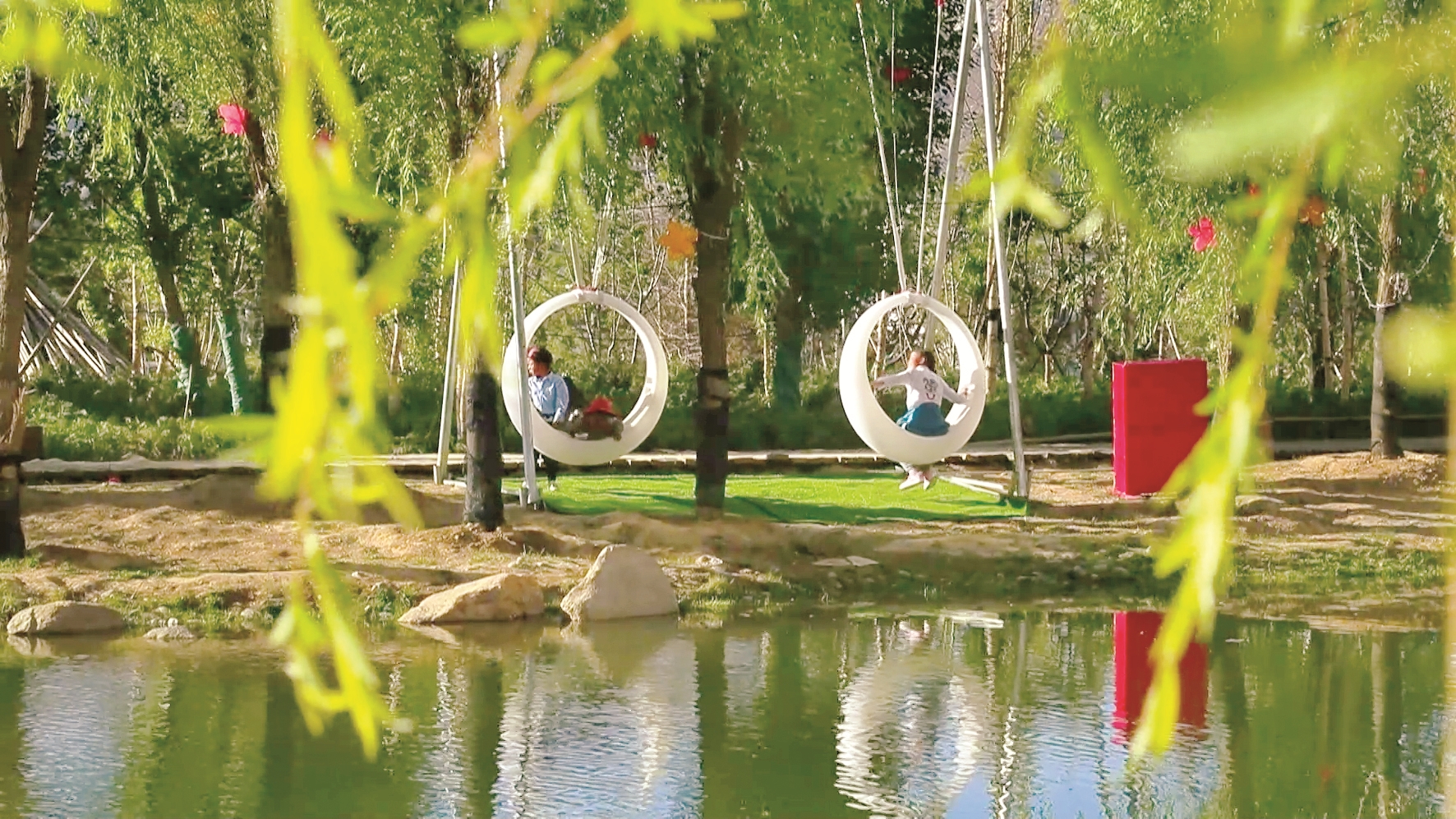 圖為孩子們?cè)趦?yōu)美的公園綠水間盡情嬉戲。 拉薩融媒記者 蘭煉平攝
