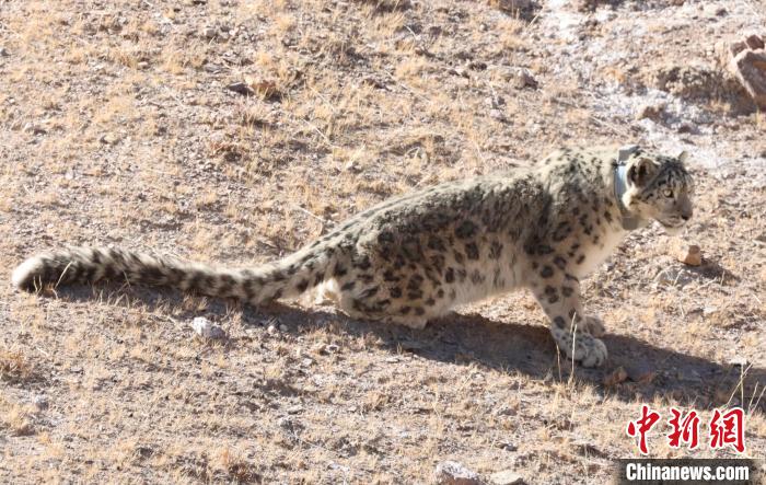 圖為佩戴衛(wèi)星追蹤項(xiàng)圈的雪豹被放歸?!∑钸B山國(guó)家公園青海省管理局供圖