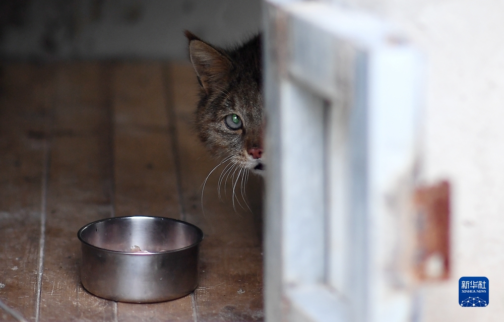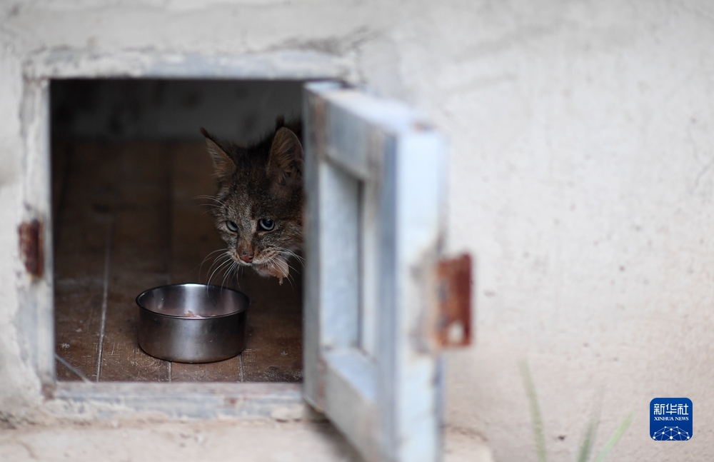 9月18日,受救護的荒漠貓在青海野生動物救護繁育中心進食。新華社記者 張宏祥 攝