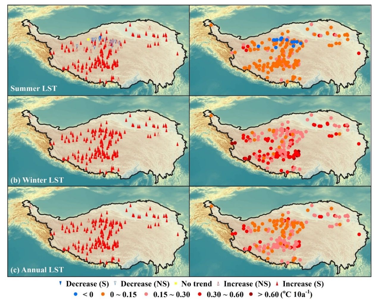 基于重建的湖面溫度時(shí)間序列,團(tuán)隊(duì)揭示了青藏高原湖面溫度的時(shí)空演化規(guī)律。研究發(fā)現(xiàn),近40年來(lái)(1978—2017年)青藏高原絕大多數(shù)湖泊的表面溫度均呈上升趨勢(shì),升溫速率約每10年0.01~0.47℃,且冬季升溫比夏季更顯著,南部湖泊升溫速率高于北部湖泊。此項(xiàng)研究成果對(duì)于未來(lái)進(jìn)一步評(píng)估氣候變化對(duì)青藏高原湖泊水熱收支變化的影響具有重要價(jià)值。