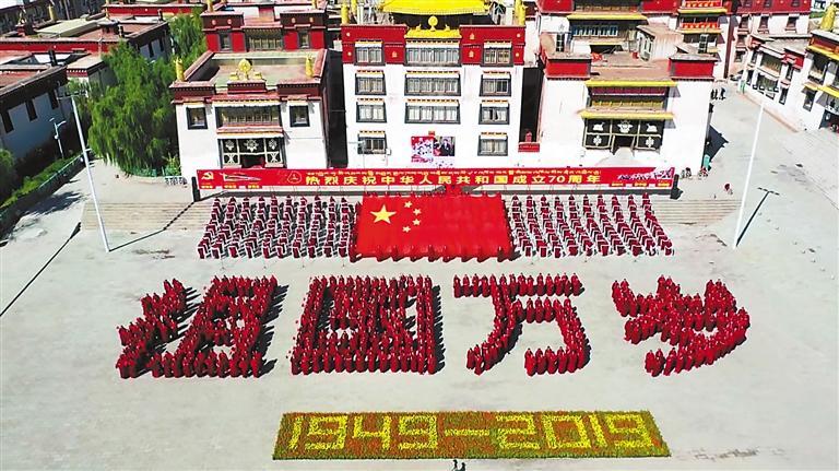 引導(dǎo)宗教界人士爭做愛黨愛國愛人民、堅(jiān)決維護(hù)祖國統(tǒng)一和民族團(tuán)結(jié)的模范。圖為2019年10月1日,西藏自治區(qū)昌都強(qiáng)巴林寺僧人以自己的方式表達(dá)對中華人民共和國成立70周年的祝福。