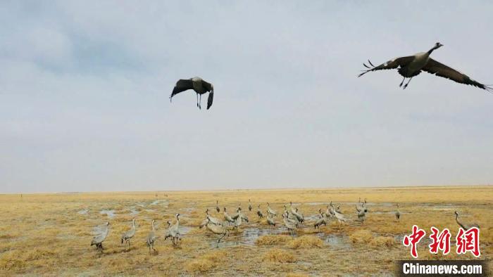 監(jiān)測顯示,格爾木市拖拉海草原是蓑羽鶴遷徙過程中的重要停歇地。每年十月初左右,少則數(shù)百只多達(dá)數(shù)千只蓑羽鶴都會聚集于此,補(bǔ)充能量,再蓄力南飛。它們在這里涉水覓食,振翅高飛,水草豐美的濕地為它們提供了歇腳的舒適環(huán)境。