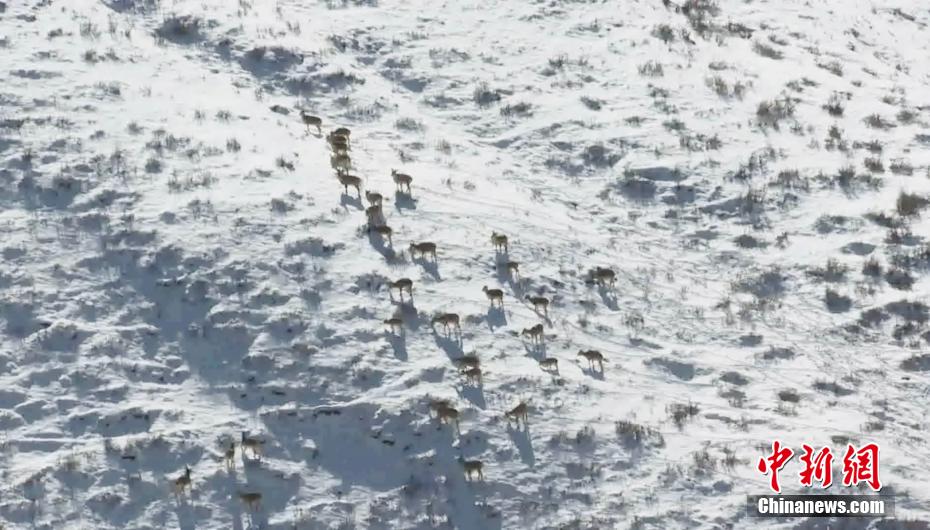 初冬時節(jié),青海省烏蘭縣攝影愛好者在烏蘭縣境內(nèi)發(fā)現(xiàn)近百只巖羊在崖壁間集體覓食,場面壯觀。據(jù)了解,巖羊?qū)賴叶壷攸c保護(hù)野生動物,常年生活在海拔2000到3000米的高山裸巖、草甸、山谷之中,具有極高的攀巖技術(shù),被稱為“巖壁上的精靈”。圖為巖羊群在雪地里覓食。 烏蘭縣融媒體中心 供圖