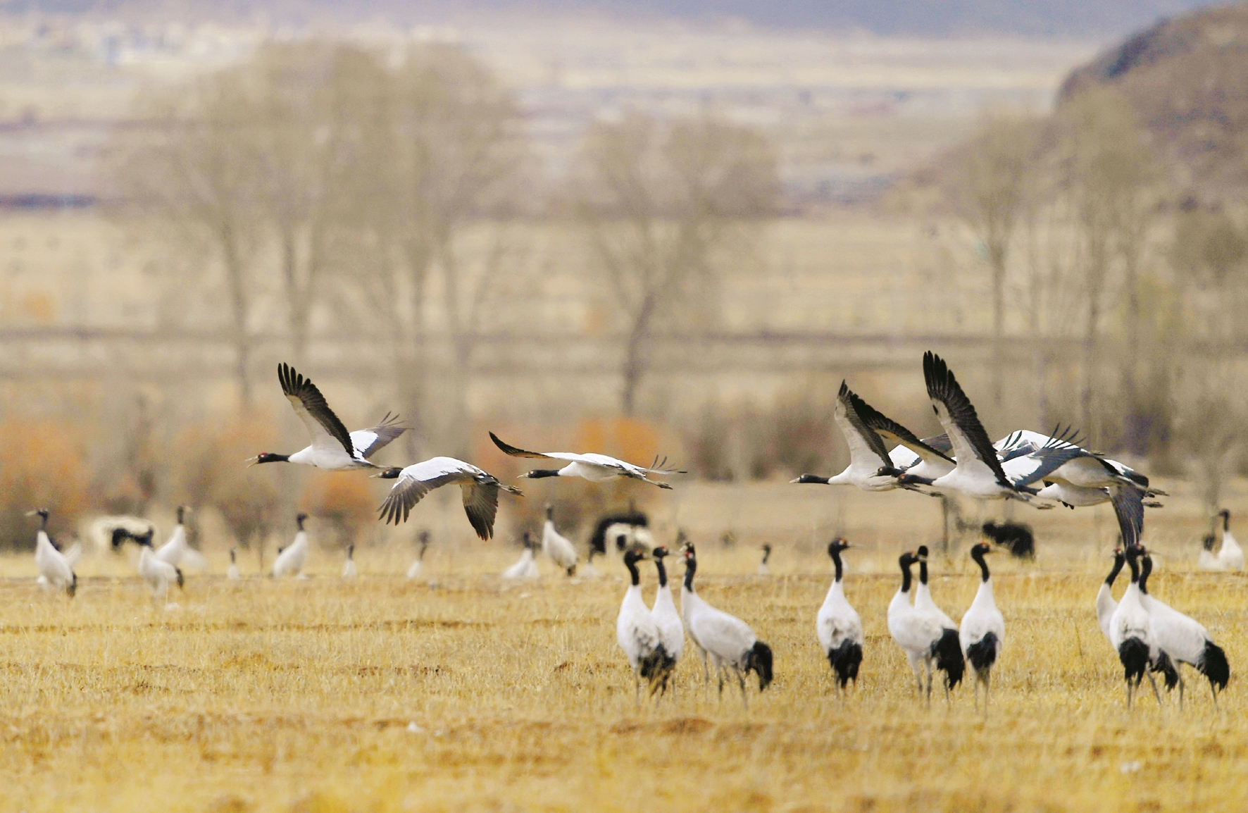 拉薩林周縣位于拉薩河上游及澎波河流域,是雅魯藏布江中游河谷地區(qū)黑頸鶴分布數(shù)量最為集中的保護(hù)區(qū)。黑頸鶴是國家一級保護(hù)動(dòng)物。目前,每年到林周縣越冬的黑頸鶴已達(dá)2000只左右,林周縣區(qū)域內(nèi)的大片濕地成為黑頸鶴的“冬季樂園”。