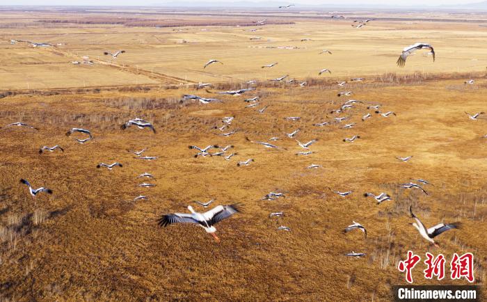 秋季集群的東方白鸛群。 黑龍江洪河國家級自然保護(hù)區(qū)管理局提供