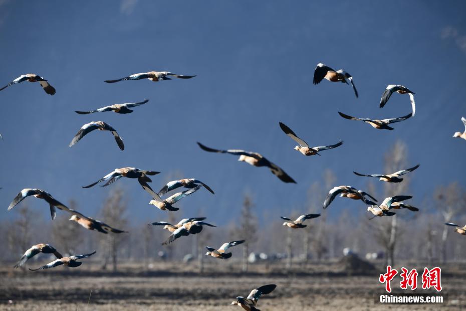 近年來,拉薩水系治理工程的實施,讓拉薩河周邊環(huán)境變得更好。每年10月中下旬,來拉薩越冬的候鳥不斷增多,在拉薩河畔處處都能看見斑頭雁、紅嘴鷗、黃麻鴨等鳥類的身影。據(jù)悉,目前,拉薩河城區(qū)段形成了3公里長的湖面水城,水城面積達1258畝,平均水深2.5米,蓄水量約105萬立方米,不僅增加了空氣濕度、含氧量,完善了城市防洪體系,還提高了地下水位,鳥類種群數(shù)量增加。圖為一群黃麻鴨在拉薩河畔的農田上飛翔。 貢嘎來松 攝