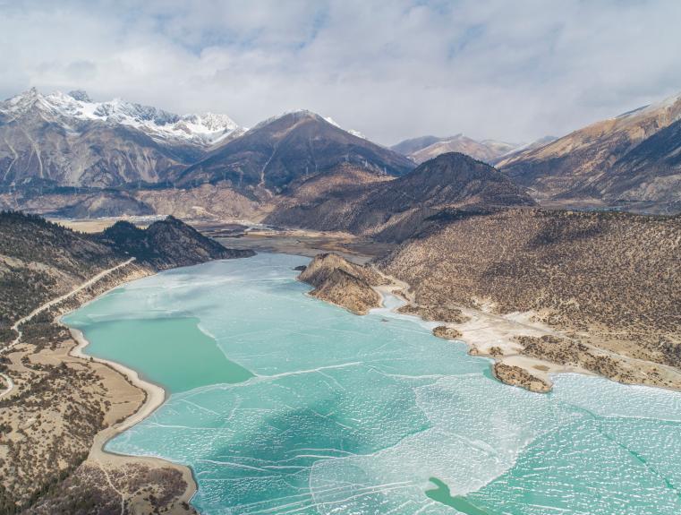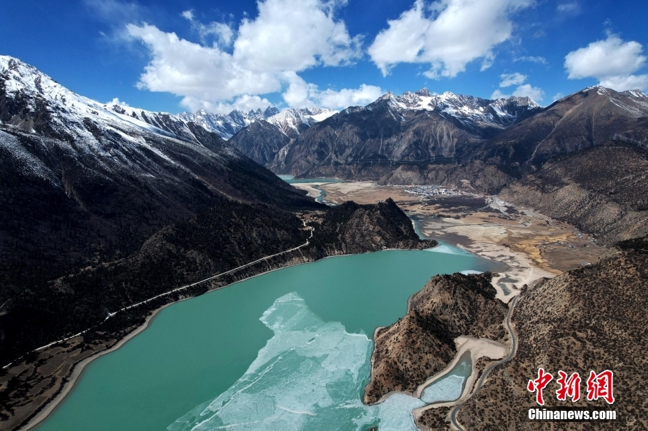 2月16日,西藏昌都,然烏湖半冰半水的湖面與雪山、藍天相互映襯,美如畫卷。(無人機照片)