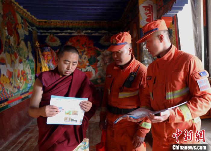 “景區(qū)內(nèi)的宗教寺廟木質(zhì)結(jié)構(gòu)比較多,周圍森林資源豐富,平時(shí)要注意用火安全,防止火災(zāi)發(fā)生?!边@是林芝市森林支隊(duì)消防員正在為德木寺景區(qū)工作人員和僧人宣傳森林消防安全常識(shí)。