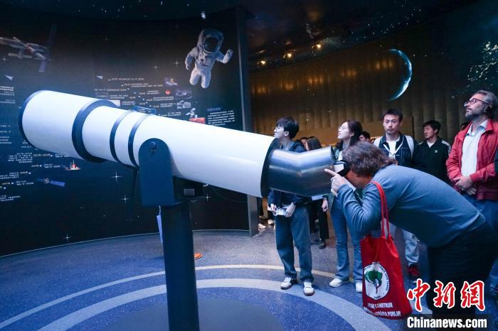 圖為一位外國政黨代表在青海省自然資源博物館內(nèi)體驗用VR技術呈現(xiàn)的天文望遠鏡。馬銘言 攝