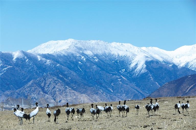 國家一級保護動物黑頸鶴在墨竹工卡縣境內(nèi)的農(nóng)田里覓食。