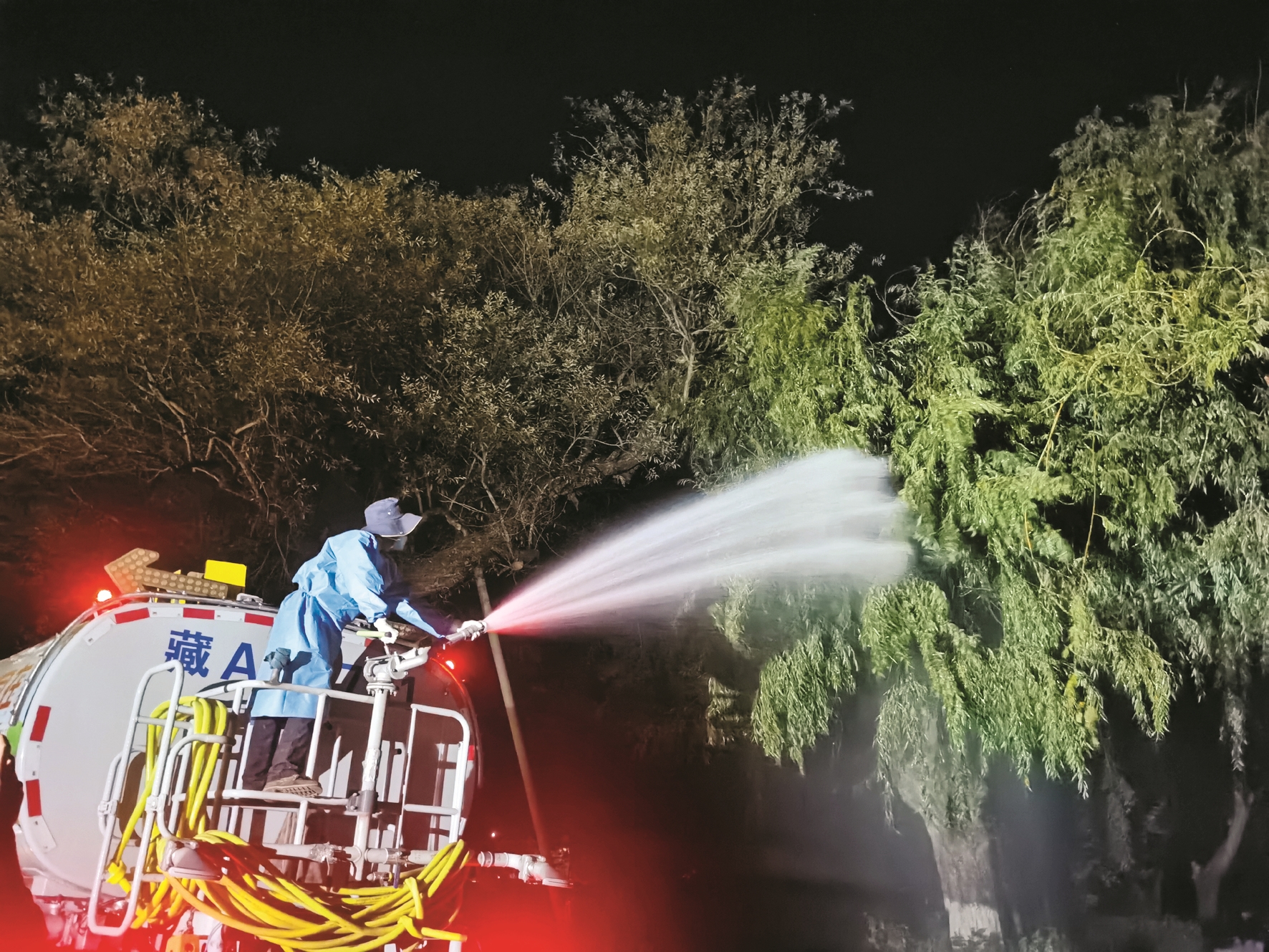 隨著夜幕降臨,羅布林卡公園內(nèi)市民游客逐漸散去,城關園林養(yǎng)護工人駕駛灑藥車開始入場,準備為園區(qū)內(nèi)的苗木進行噴藥殺蟲作業(yè)。雨季過后,拉薩氣候較為干爽,為蟲害滋生提供了溫床,城關園林養(yǎng)護人員在前期排查發(fā)現(xiàn),羅布林卡公園廣場的苗木上有不同程度的柳葉蜂、柳大蚜蟲害現(xiàn)象。經(jīng)過技術人員的“把脈問診”,確定害蟲種類、生長階段后,城關園林當天組織兩輛大型灑藥車對園區(qū)進行集中作業(yè),以預防大范圍的蟲害以及幼蟲化蛹越冬。