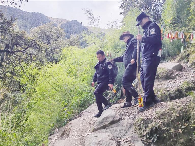 “事發(fā)地點在苯日山景區(qū)核心區(qū),山坡陡峭,荊棘密布,山高風大,又有降雨,搜救工作具有一定難度??紤]到苯日山景區(qū)海拔較高,唐先生已在山上逗留時間較長,可能出現(xiàn)體能耗盡、通訊設(shè)備電量不足等問題,我們必須加快搜救進程。”米瑞鄉(xiāng)派出所民警四郎羅布回憶道。該所民輔警平日經(jīng)常開展巡山工作,對山路非常熟悉,最終在三小時內(nèi)成功鎖定唐先生的位置。