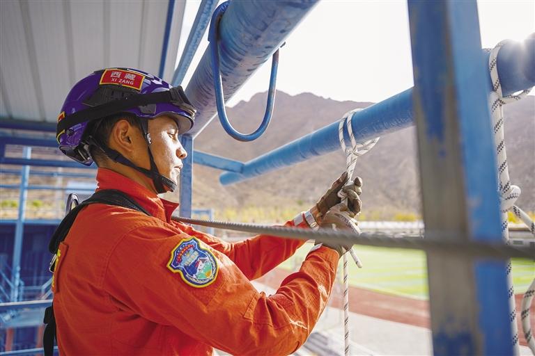 迅速打好繩結(jié)、扣好安全帶……27歲的仁增論珠身著全套戰(zhàn)訓(xùn)服,正在進(jìn)行繩索下降訓(xùn)練。身姿矯健、動(dòng)作干凈利落,眨眼間,他已安全降至地面。仁增論珠從小就有個(gè)當(dāng)兵夢(mèng),2015年,他應(yīng)征入伍,三年部隊(duì)生活錘煉了他的體能和意志。2019年,仁增論珠入職自治區(qū)森林消防總隊(duì),成為一名消防戰(zhàn)士,繼續(xù)為保家衛(wèi)國(guó)貢獻(xiàn)自己的力量。