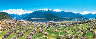 三四月間,漫山遍野的桃花開了,白的花、粉的花、紅的花,或是沿著山谷向幽深處蔓延,或是向開闊處鋪展……再遠處,是白雪皚皚的山峰,映著湛藍的天,色彩明朗如畫。
