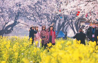 桃花節(jié)期間,游客在嘎拉村桃花源景區(qū)拍照留念。記者 徐馭堯 攝