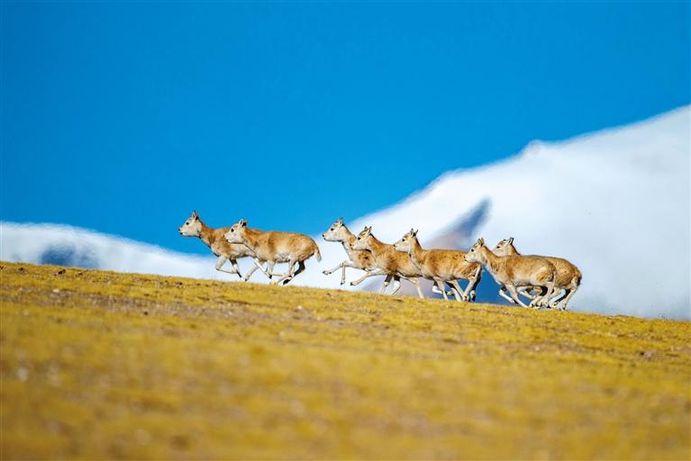 圖為在羌塘國(guó)家級(jí)自然保護(hù)區(qū),一群雌性藏羚羊在奔跑。新華社記者 姜帆 攝